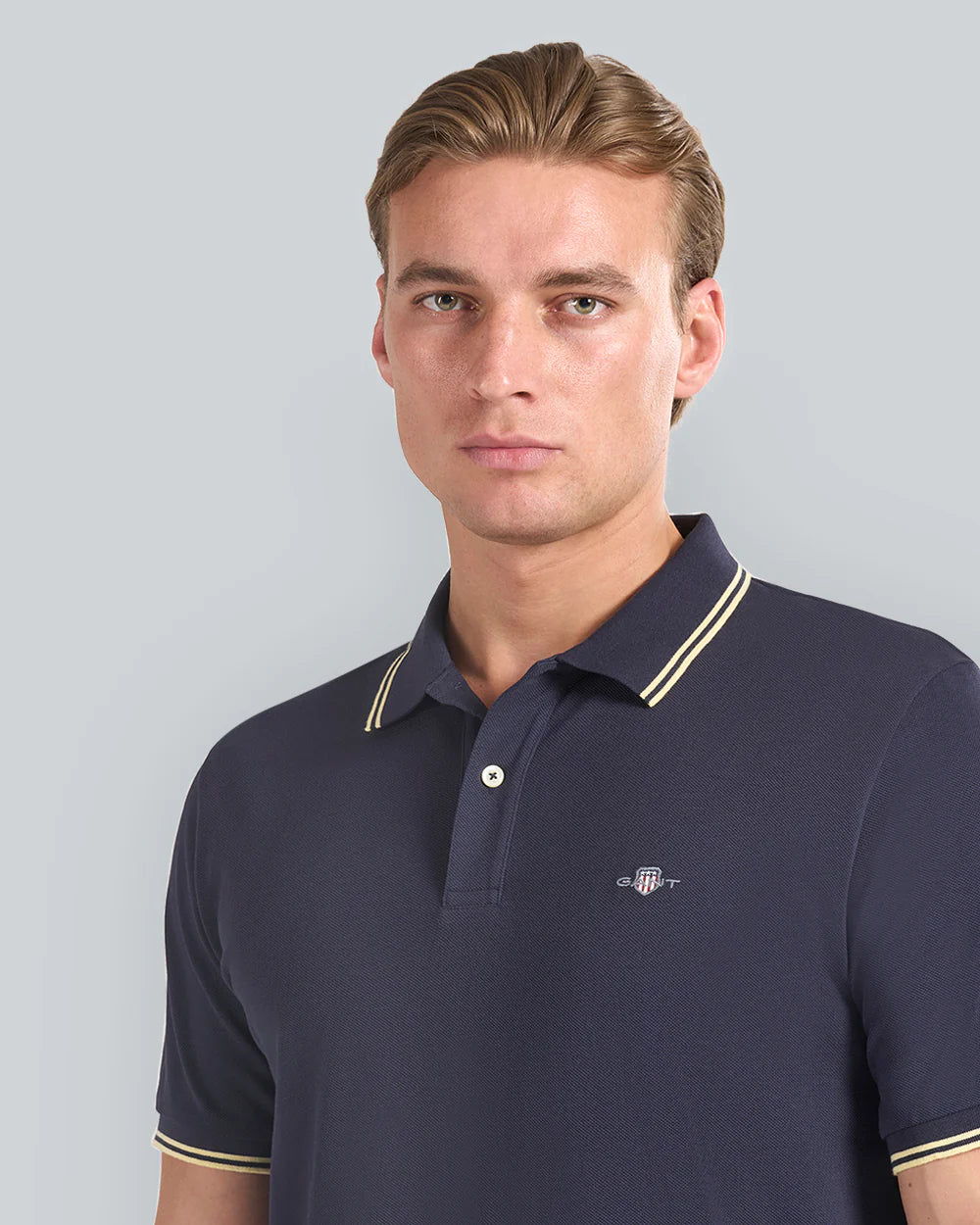Elevate your casual style with this navy polo featuring white contrast tipping. The premium cotton fabric ensures comfort, while the classic fit and discreet GANT logo provide a polished look suitable for various occasions, from casual Fridays to weekend outings.
