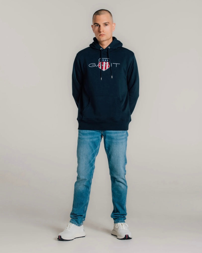 The GANT Shield Hoodie is back. Made of a plush cotton-blend jersey with a brushed lining that feels super soft and cozy to wear. Featuring the classic Shield Logo embroidered across the chest, this casual statement piece is made for your off-duty activities and ultimate comfort. It is detailed with a drawstring hood, a kangaroo pocket and ribbed detailing at the hem and cuffs.