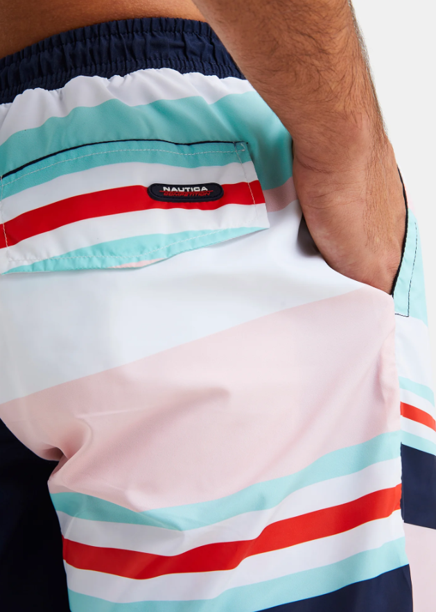 The Morecambe Swim Short. Level up your holiday style in the Morecambe swim shorts. Perfect for your around the pool style, these swim shorts are complete with stripe repeat pattern on one leg. Complete with drawcords, these swim shorts feature the Nautica Competition embroidered branding on the leg.