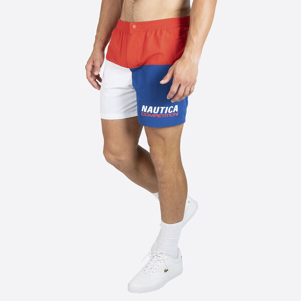 Level up your holiday style in the Cortes swim shorts. Perfect for your around the pool style, these swim shorts are a great wardrobe addition. The 6" length mens shorts have an elasticated waistband with a button closure for an optimised fit, alongside side entry pockets for all your essentials. Complete with panelling design, these swim shorts feature the Nautica Competition plastisol print branding on the leg.