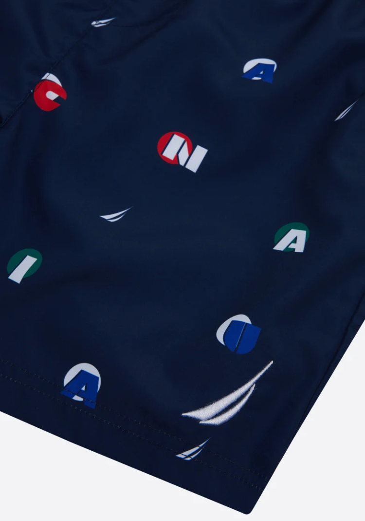 The Simian Swim Shorts. Keep your child comfortable at the beach or pool with these quick drying swim shorts. Featuring an elasticated waistband with drawcords for the perfect fit and side seam pockets for essentials, these shorts are complete with a rainbow stencil all over print and the Nautica embroidered logo.