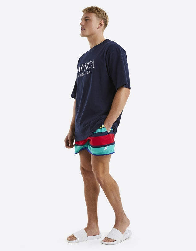 The Radon Swim Shorts. Level up your style in the Radon 6” swim shorts. With an elasticated waistband and drawcords, these shorts are made for the perfect fit. Featuring a back pocket to carry poolside essentials, these swim shorts are a wardrobe must-have. Complete with an all-over standout print and the Nautica embroidered branding on the leg to show off your style.